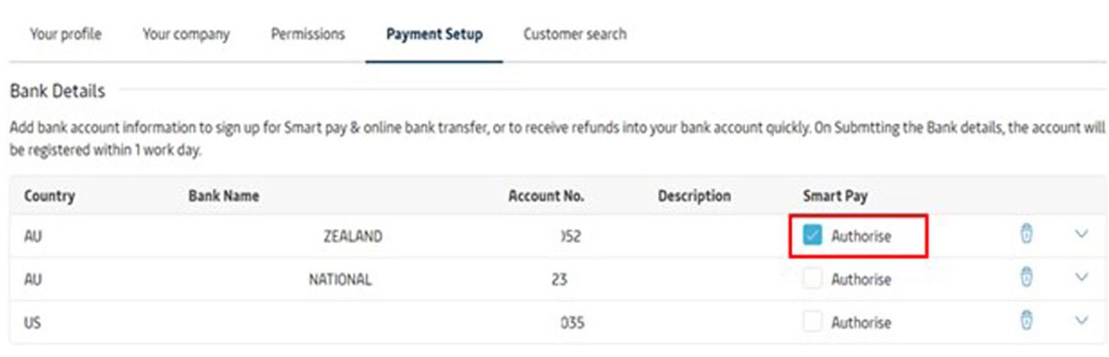 - Once your bank account is set up in MyFinance, Authorise’ tick box will show a check mark in the Smart Paycolumn.